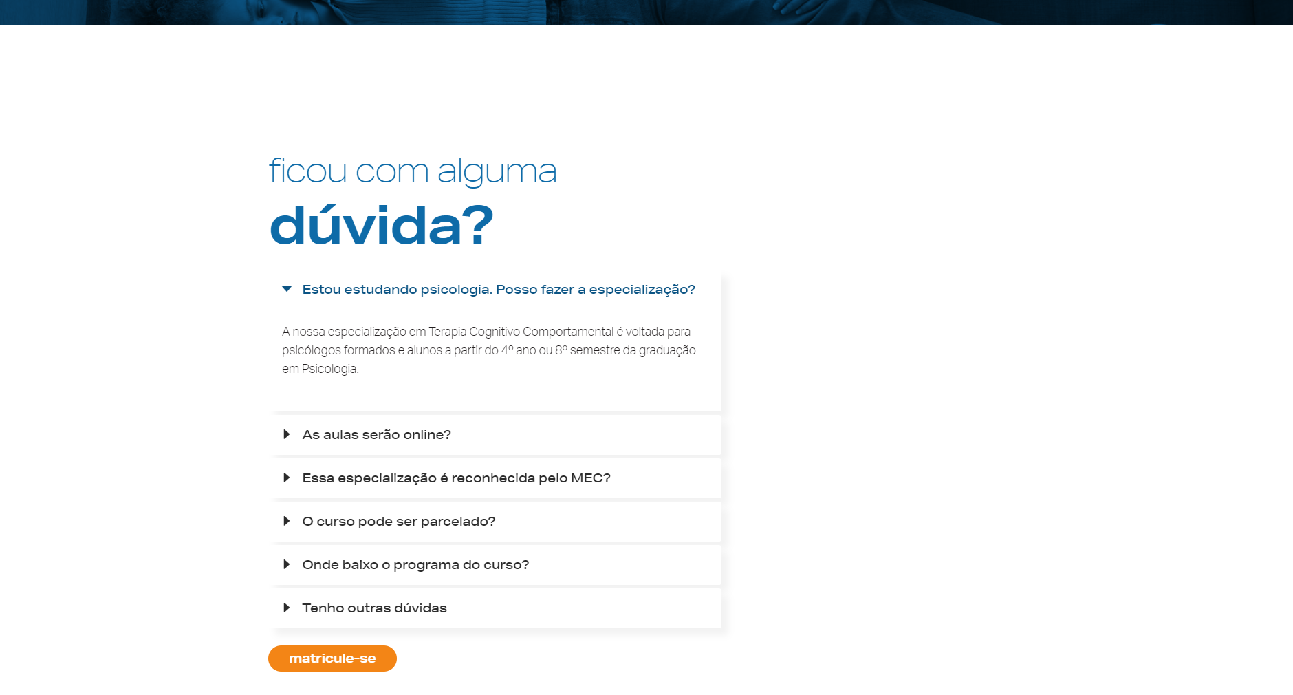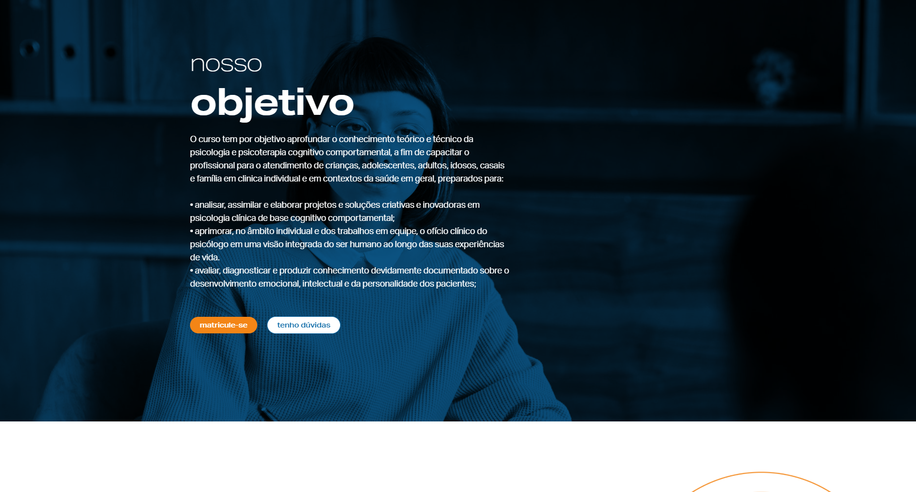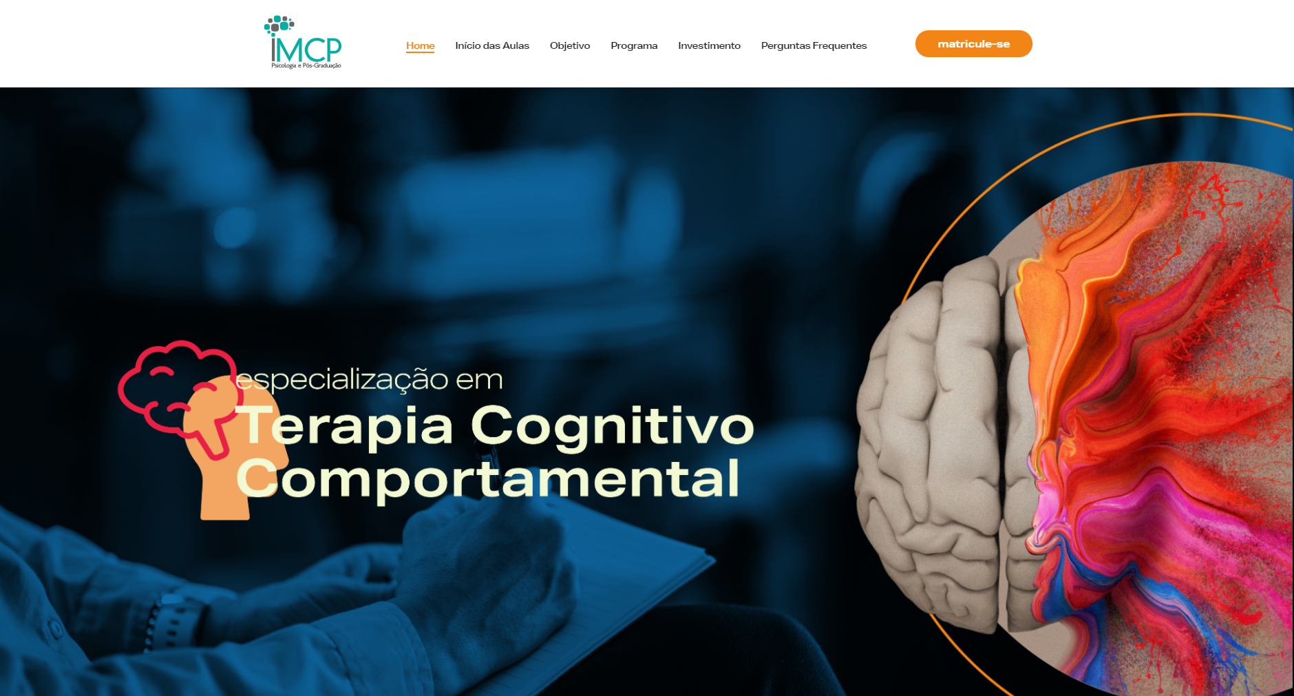 O IMCP nos procurou para o desenvolvimento da landing page para a nova pós graduação em Terapia Cognitiva Comportamental oferecida por eles em parceria com a UniFil. Para este curso, desenvolvemos um layout com cores mais escuras e tipografias mais modernas.
