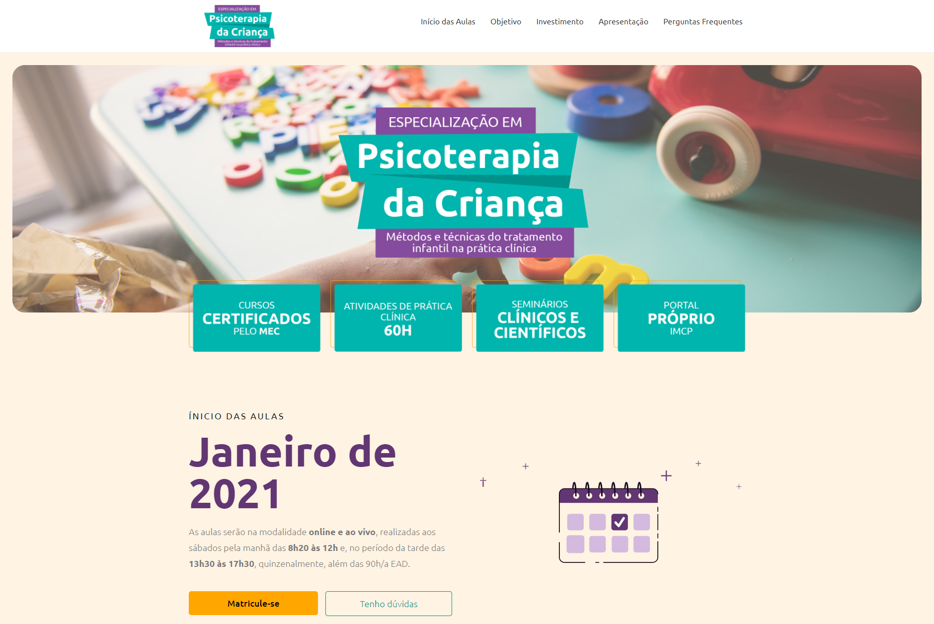 Para a Pós em Psicoterapia da Criança, o IMCP nos procurou para criarmos a identidade visual do curso e tambem a landing page para coleta da sinformações de contato dos interessados. Por ser uma pós voltada ao cuidado com crianças, nos preocupamos em utilizar cores alegres, tipografias amigáveis e tamanhos de fontes grandes para passar a idéia do cuidado.