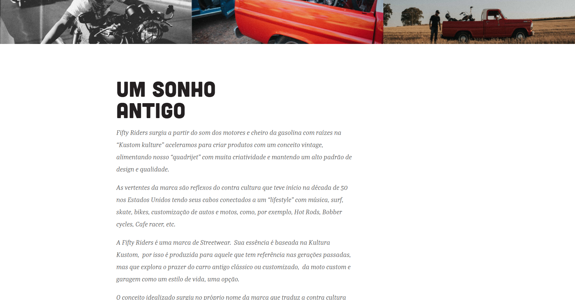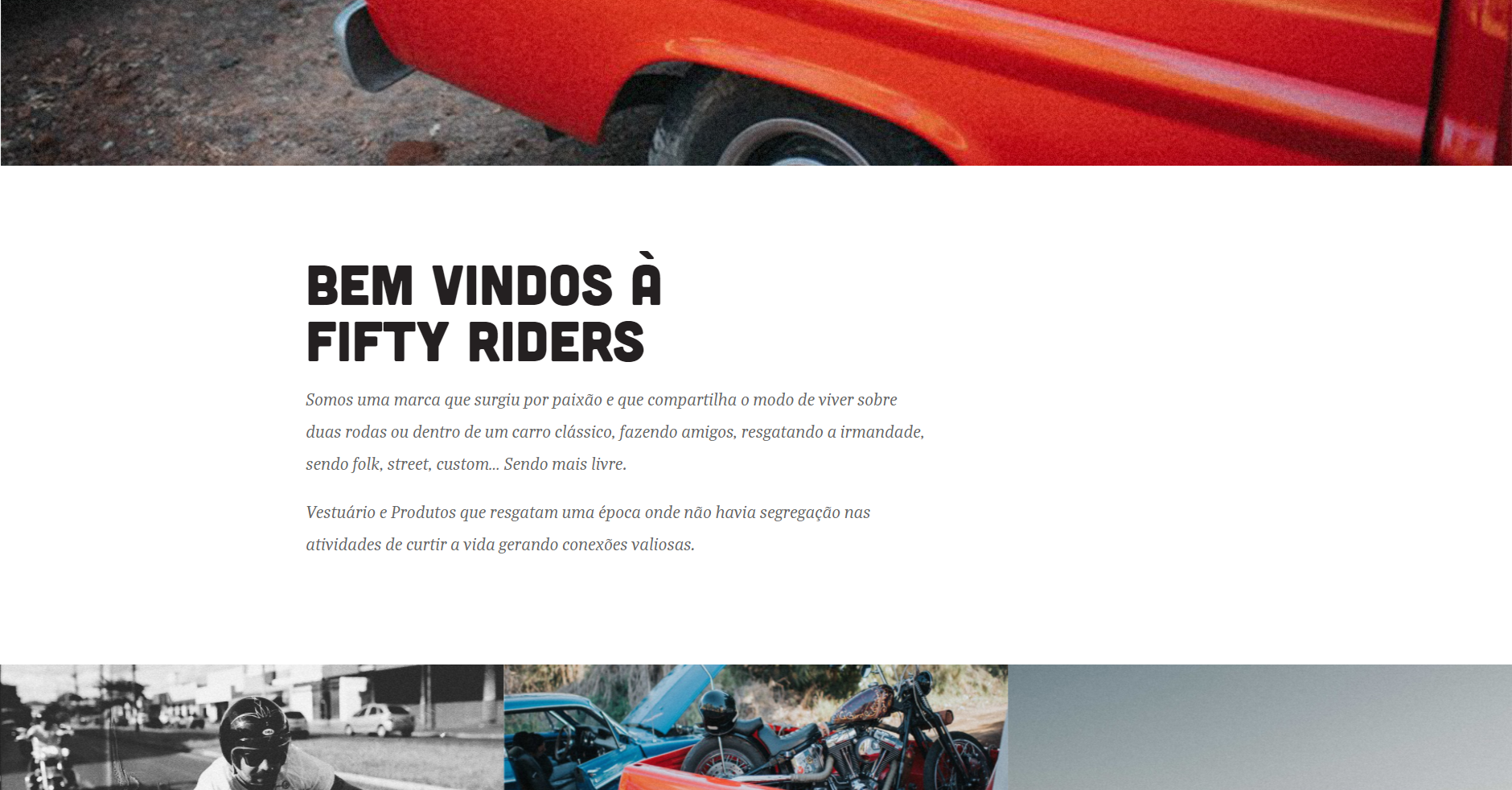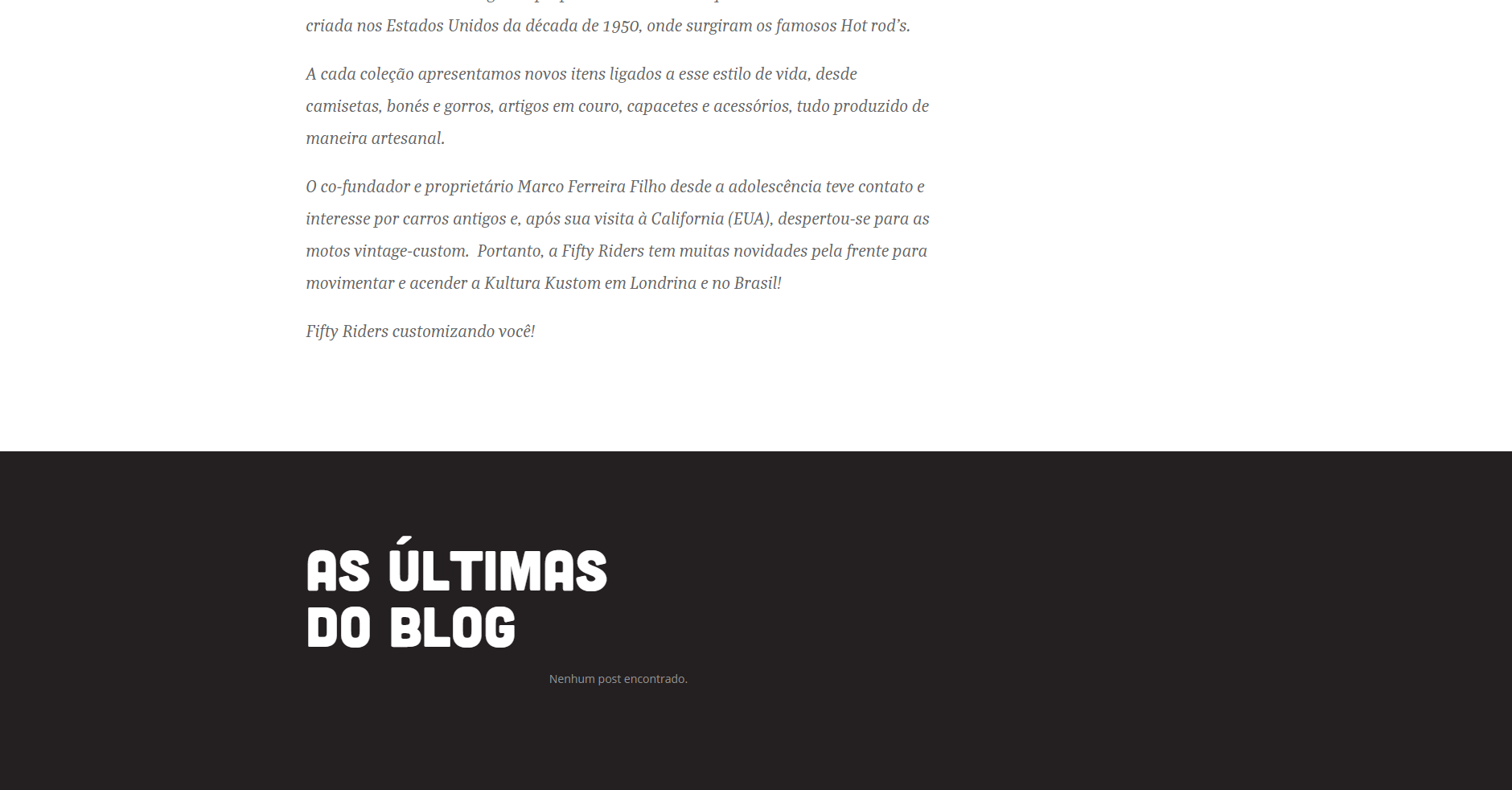 A Fifty Riders é uma marca de street e lifestyle de Londrina que passou por uma reestruturação no site institucional, deixando mais moderno e principalmente: unificado, já que anteriormente, o site possuia diversos locais de acesso que acabavam quebrando o fluxo e o nosso objetivo era trazer tudo para o mesmo local.
